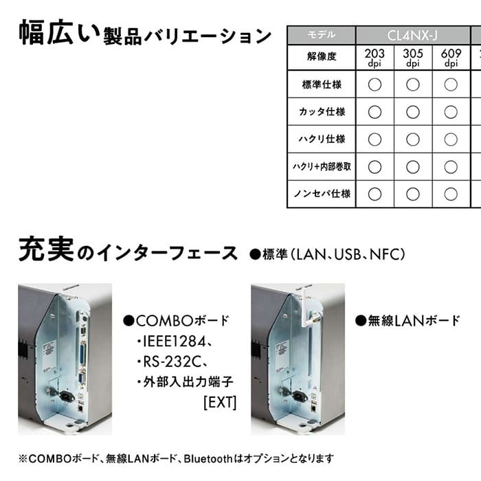 その他オプション:外部ラベル供給装置、外部ラベル巻取装置、簡易ラベルスタッカ、RTC(カレンダ)キット、発行ボタン、RFID UHFキット(ISO / IEC18000-6 TypeC Gen2)、RFID HFキット(ISO / IEC15693, ISO / IEC14443 TypeA, FeliCa Lite-S)