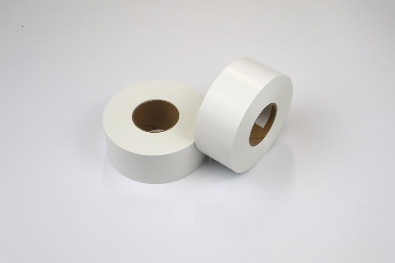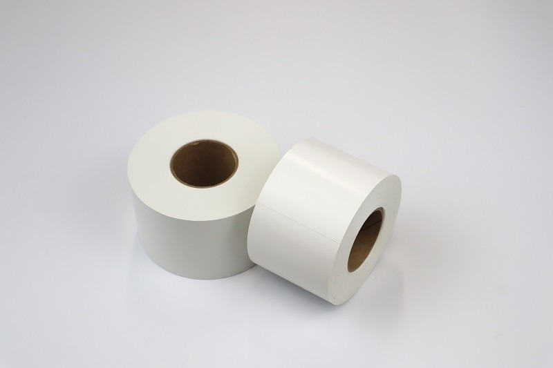 台紙や裏紙がない粘着性ラベル用紙。凹凸のある表面にも貼付可能な粘着力の強い、強粘着タイプ。サイズ 幅80×外径102×内径40mm